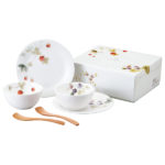 ストロベリーとブラックラズベリー柄のプチボウルとプレートのアソートセットです。木製のヨーグルトスプーンで楽しいひと時を。手作りのジャムとパンにぴったりの相性です。食器と同じ絵柄の化粧箱に入っています。贈り物にもおすすめです。
