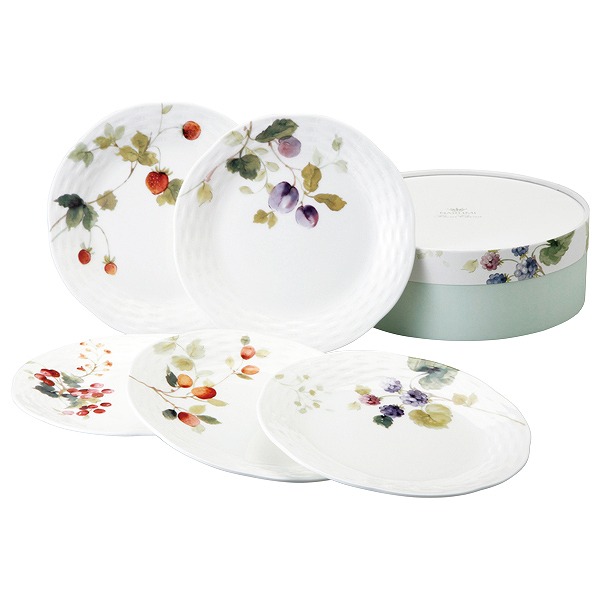 パンやデザートを取り分けるのにちょうどよいプレートのアソート。5枚がきちんと収まる同じデザインの化粧箱入りで贈り物に最適です。